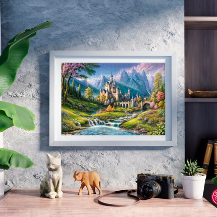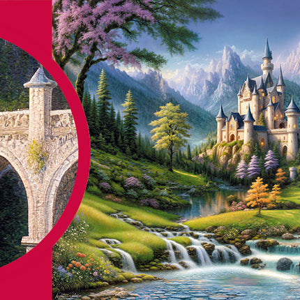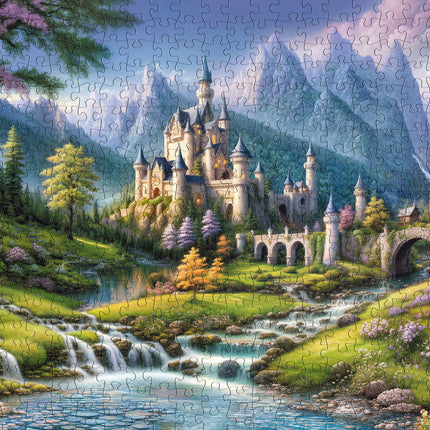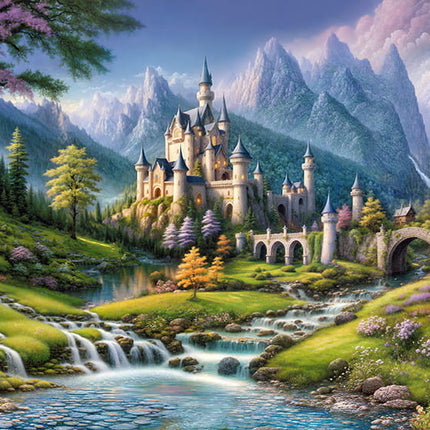 Once upon a time, the kingdoms of the fairytale world lived in perfect harmony... Discover a beautiful color image that takes you on adventures to the land of fairy tales and magic. This majestic castle towers above the mountains. Imagine the wonderfully refreshing breeze of a beautiful stream flowing through the green meadow.