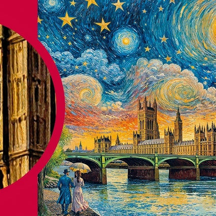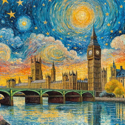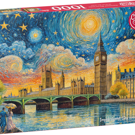 Bring the cosmopolitan city of London to life with the Cherry Pazzi puzzle - Impressionist Sky over London! This beautiful 1,000-piece puzzle transports you to an atmospheric scene where the London skyline is enveloped in an explosion of color and movement. Inspired by the Impressionist art style, this image captures the energy and charm of the city beneath a vibrant, swirling sky.
