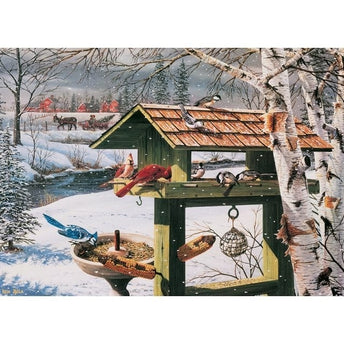 Pak een kopje koffie, een gezellig plaid en knuffel met dit klassieke 'erker'-uitzicht. Het landschap strekt zich uit achter een kabbelend beekje en een zwerm hongerige kardinalen, mezen en boomklevers, naast een vriendelijke blauwe gaai terwijl de sneeuwvlokken naar beneden drijven. Deze prachtige puzzel van 1000 stukjes, gemaakt in de VS, heeft een nauwkeurig uitgesneden afbeelding op hoogwaardig blauw karton. De volledig in elkaar grijpende stukken zijn verpakt in polyzakken om hun bescherming binnen de plank te garanderen
