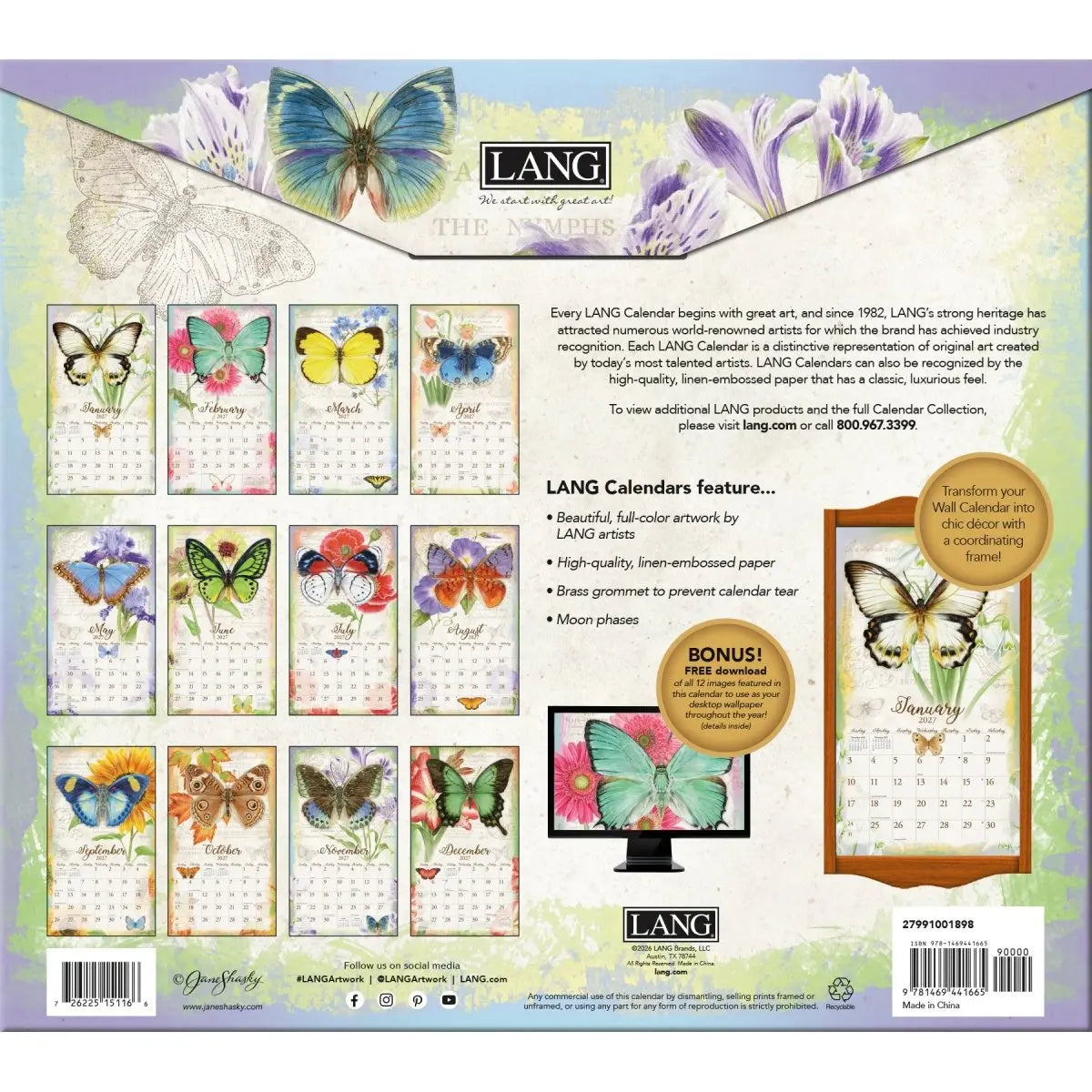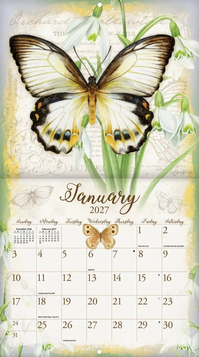 Laat je betoveren door de prachtige Butterflies Kalender 2027, een stijlvolle toevoeging aan elk interieur. Deze kalender combineert functionaliteit met kunst en biedt een jaar lang genieten van adembenemende illustraties van Jane Shasky. Haar verfijnde kunstwerken, geïnspireerd door de natuur, brengen de schoonheid van vlinders en bloemen tot leven.