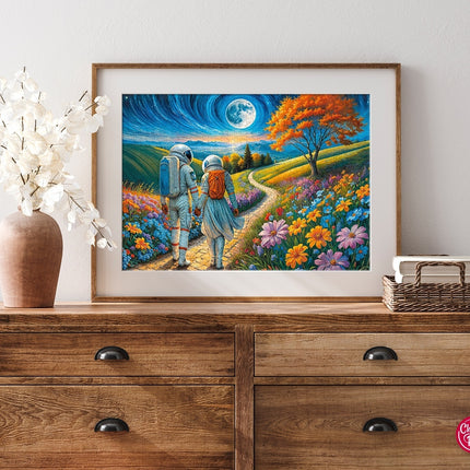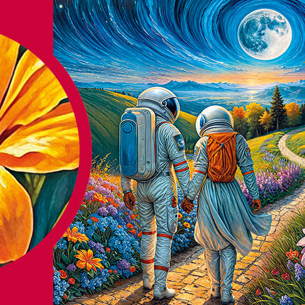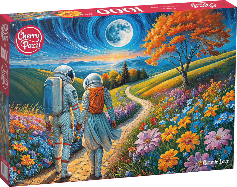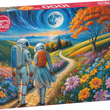 Bekijk deze magische liefdesreis met de Cherry Pazzi puzzel Cosmic Love! Deze bijzondere maar prachtige 1000-delige legpuzzel toont een astronautenstel dat hand in hand door een zonovergoten weide wandelt. Terwijl de maan hoog aan de horizon opkomt, stralen liefde en avontuur samen in dit meeslepende kunstwerk.