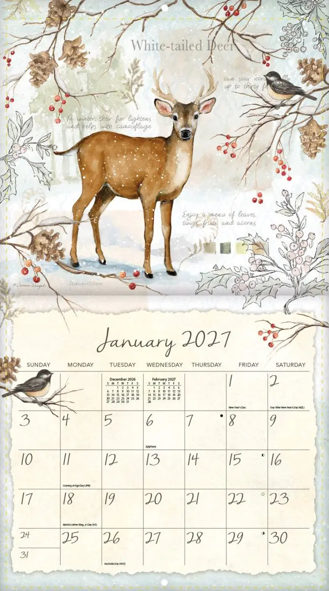 Breng de schoonheid van de natuur in huis met de Field Guide Kalender 2027. Deze prachtige wandkalender biedt een jaar lang inspiratie met sfeervolle kunstwerken van Susan Winget, bekend om haar gedetailleerde en warme illustraties.