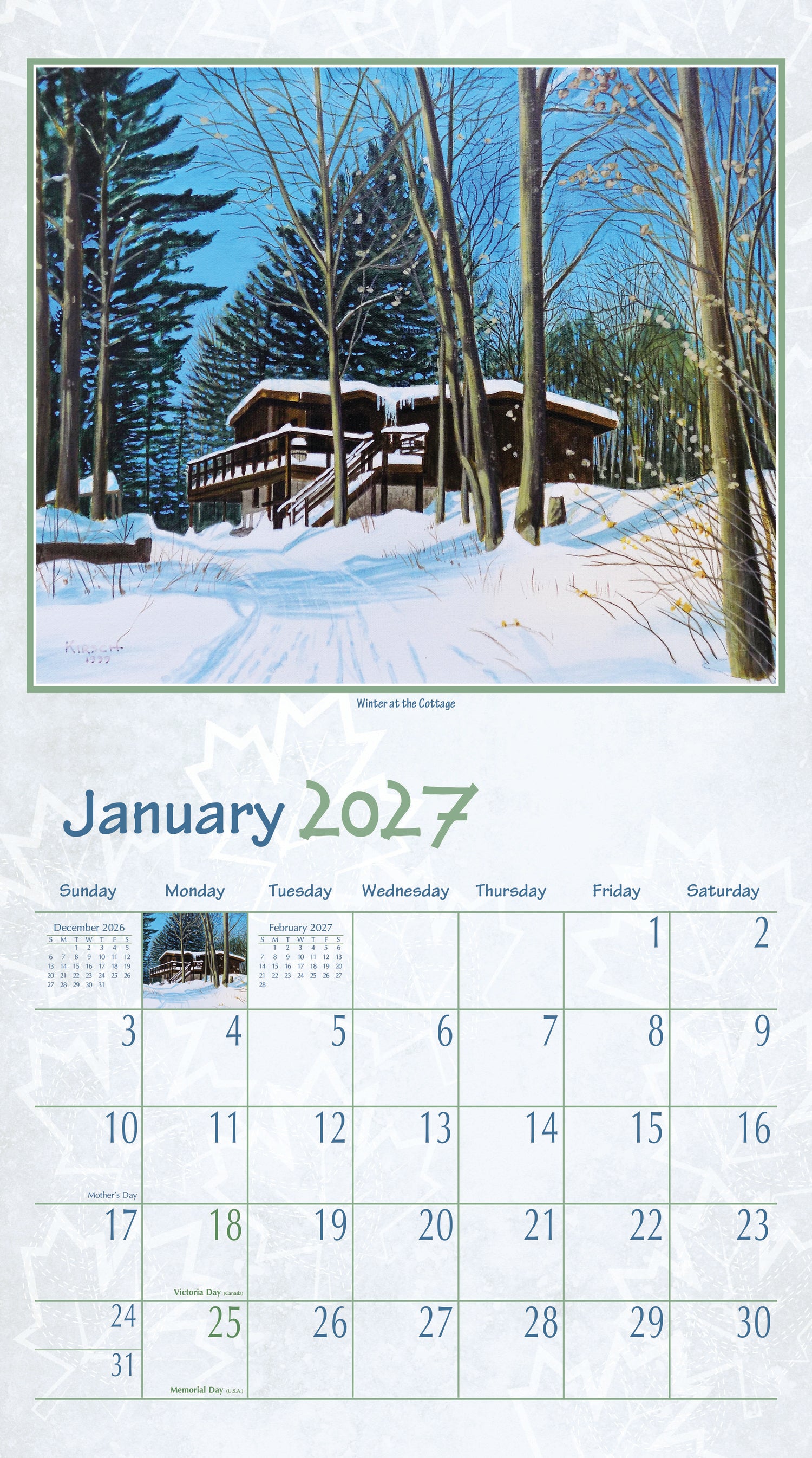 Ervaar de stilte, ruimte en zuivere lucht van het noorden met de Northern Getaway Kalender 2027. Deze rustgevende maandkalender toont twaalf prachtige schilderijen van Kenneth Kirsch, meester in het realistisch vastleggen van Canadese meren, bossen, rotsformaties en afgelegen hutten. Zijn werk straalt rust en reflectie uit – ideaal voor wie houdt van natuur, eenvoud en ongereptheid. De kunstwerken zijn gedrukt op hoogwaardig linnenstructuur papier, wat zorgt voor extra diepte en sfeer.