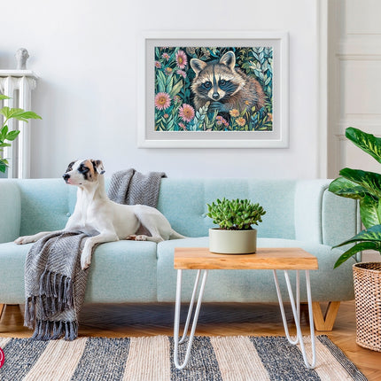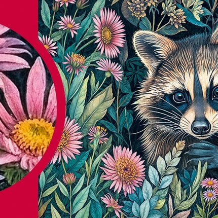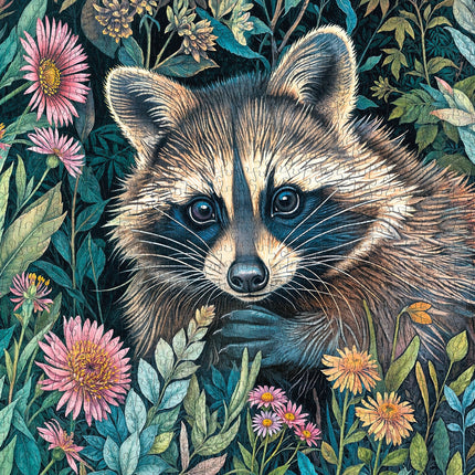 Deze prachtige puzzel van een schattige wasbeer die zich nestelt tussen prachtige kleurrijke bloemen, gevangen in een dromerige pastelillustratie is de perfecte mix van rust en uitdaging voor elke puzzelliefhebber!
