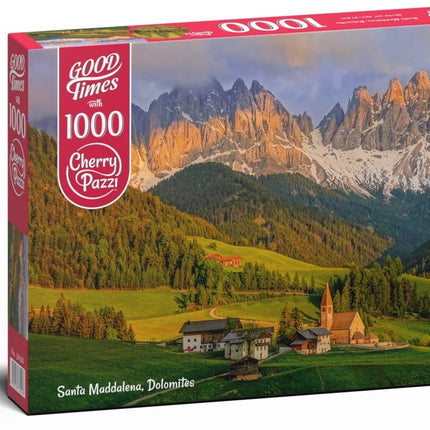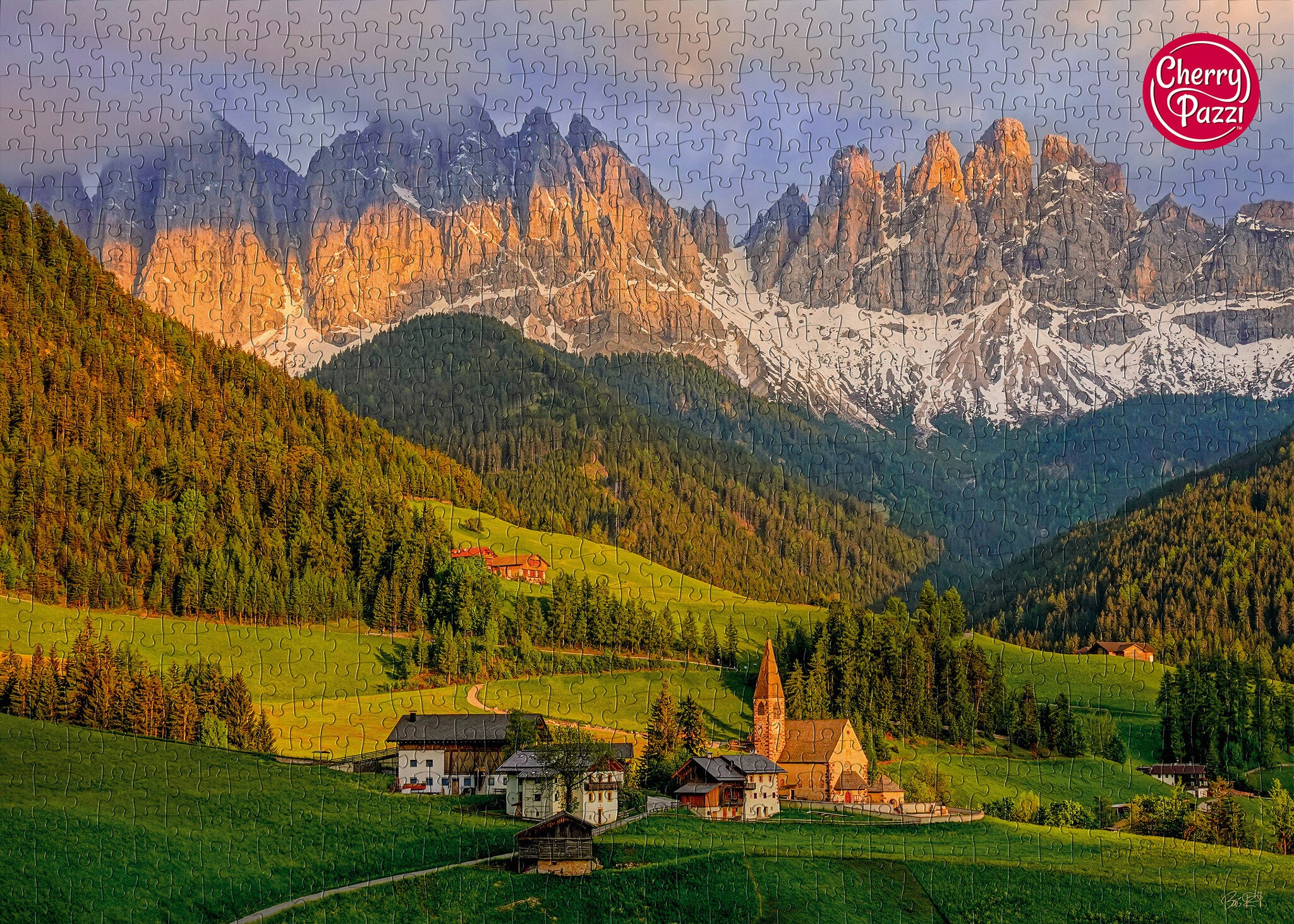 De Cherry Pazzi Puzzel 1000 Stukjes – Santa Maddalena, Dolomites is niet zomaar een puzzel; het is een reis naar een van de mooiste landschappen van Italië. De zachte schemering, de groene valleien en de ruige bergtoppen zorgen voor een betoverend geheel.