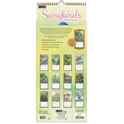 Breng de schoonheid van zangvogels tot leven in uw huis met de Songbirds Kalender 2026. Deze verfijnde kalender is gedrukt op luxueus papier met een elegante linnenstructuur en bevat betoverende originele kunstwerken van Susan Bourdet. Haar gedetailleerde illustraties vangen de mooie essentie van zangvogels in hun natuurlijke habitat, waardoor elke maand een visueel plezier wordt.