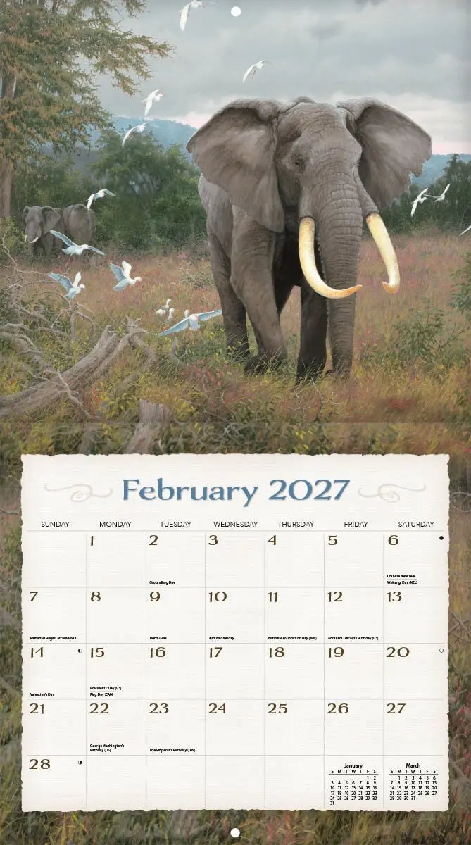 Breng een vleugje exotische elegantie en inspiratie in huis met de Spirit of Africa Kalender 2027! Deze prachtige kalender, geïllustreerd door de getalenteerde kunstenares Nicole Tamarin, toont elke maand een sfeervol kunstwerk geïnspireerd op de kleuren, landschappen en dieren van Afrika.