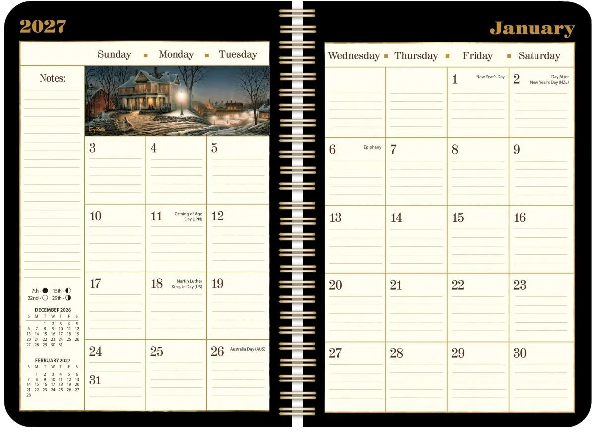 Laat je inspireren door de tijdloze kunst van Terry Redlin met de Terry Redlin Agenda 2027. Deze prachtige agenda brengt een jaar lang de sfeervolle en gedetailleerde schilderijen van een van Amerika’s meest geliefde landschapskunstenaars tot leven.