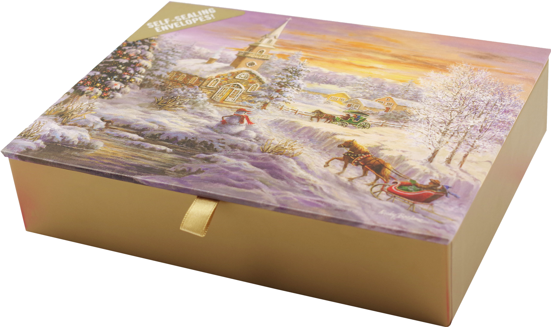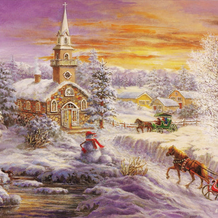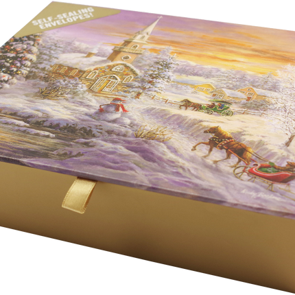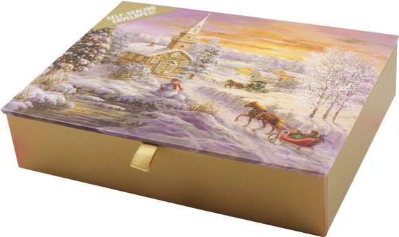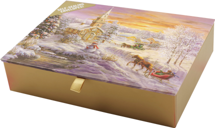 Goudkleurige wenskaarten tonen een dorpskerk vóór de avonddienst, terwijl de gemeenteleden arriveren met paard en slee of wagen. Een lachende sneeuwpop staat klaar om hen te begroeten.