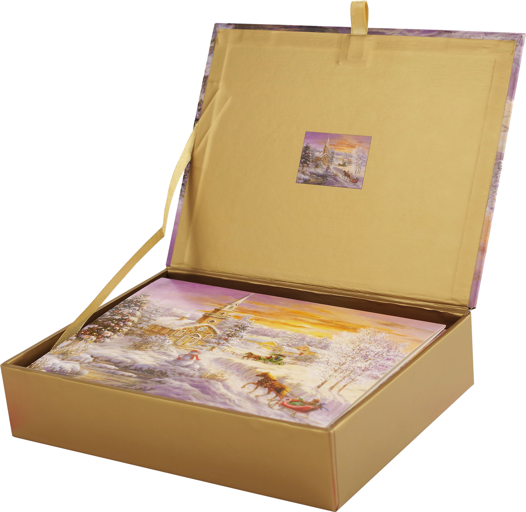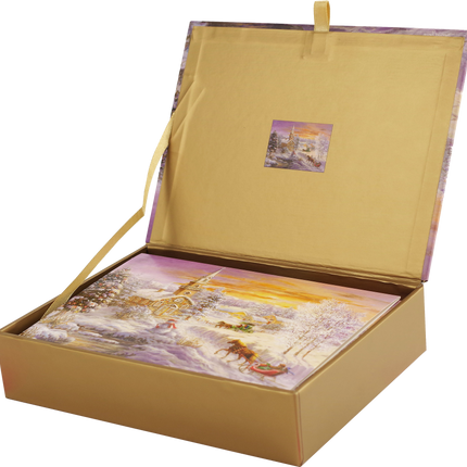 Stevige, herbruikbare doos met een reproductie van het kaartontwerp op het deksel. Binnenin wordt een kleinere afbeelding gerepliceerd.
